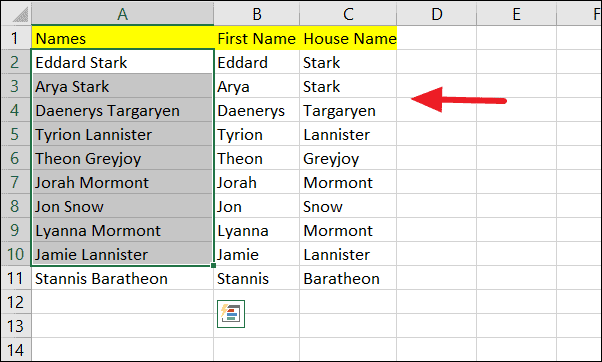 Step 4: Repeat the process in another adjacent column to extract the last names. Type the last name of the first entry (e.g., "Stark" in cell C2), then use the Flash Fill feature to populate the rest of the column.