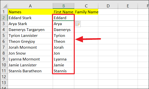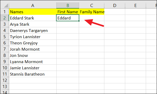 Step 1: In a new column adjacent to your data, manually type the first entry as you want it to appear. For instance, if you have "Eddard Stark" in cell A2, type "Eddard" in cell B2 to extract the first name.