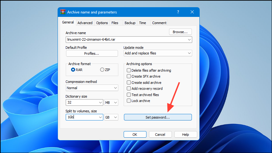 - If you want, you can use the 'Set password' button to protect your archive. Once you're ready, click on the 'OK' button to start splitting the large file into smaller ones.