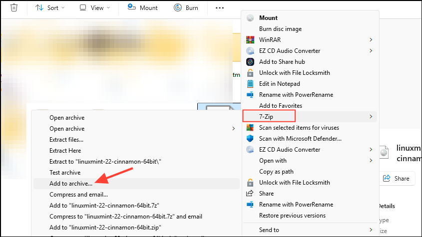 - Install 7-zip after downloading the setup and then go to the file you want to split. Right-click on it and go to 'Add to archive' and then '7-Zip' from the sub-menu.