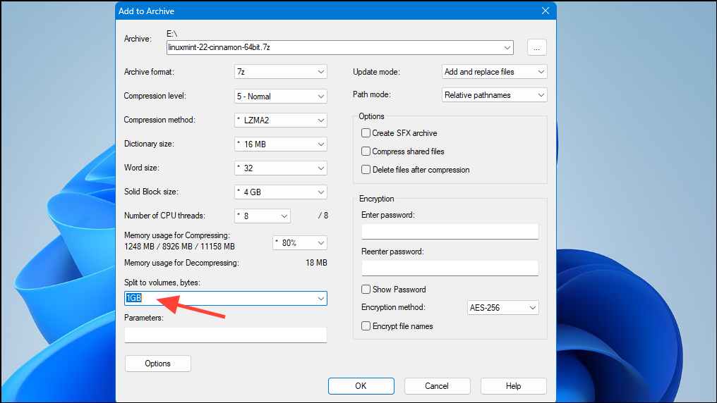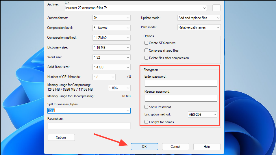 - You can use the 'Encryption' option to password-protect your split files if you want. Leave the other settings to their default values and click on the 'OK' button.
