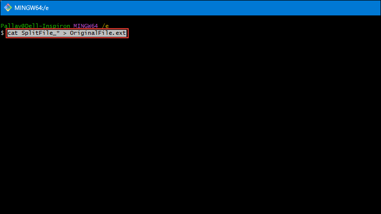 - Use the following script in Git Bash to recombine the split files into a larger file, replacing 'OriginalFile.ext' with the name you want the recreated file to have and replacing 'SplitFile_' with the prefix you used earlier for the split files.