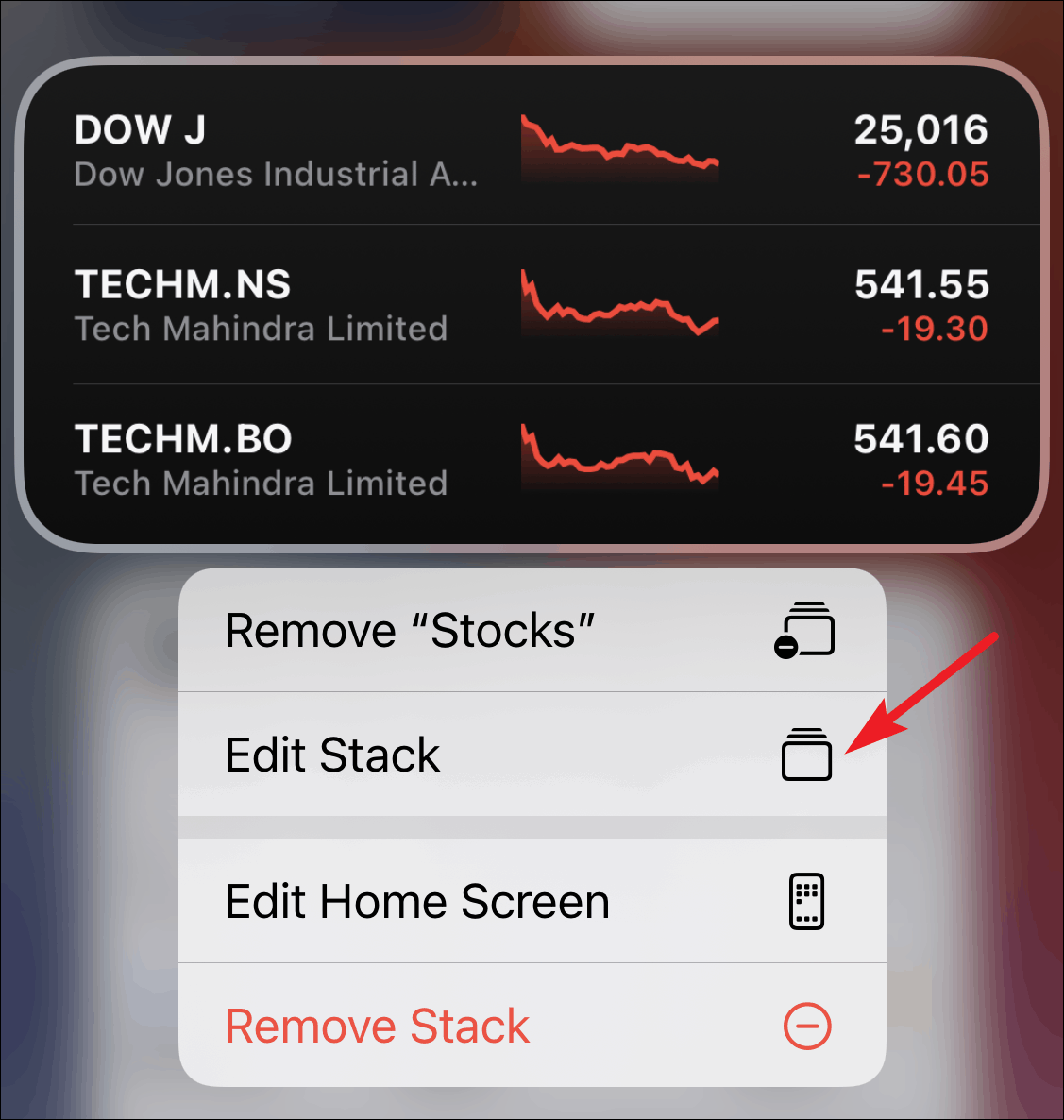Tap and hold the stack you want to edit. Then select ‘Edit Stack’ from the Home screen actions that appear.