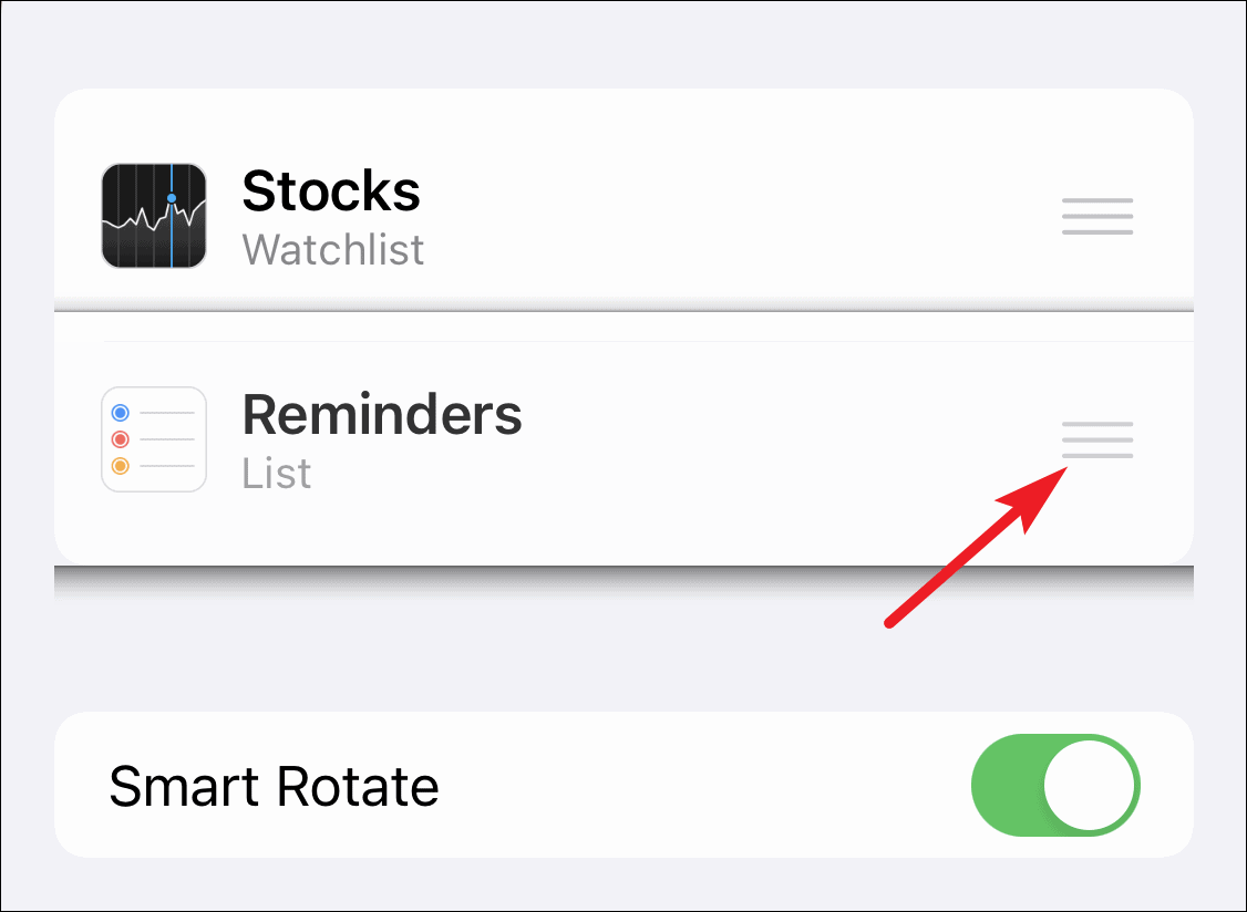 The list of widgets will open. To rearrange the widgets, place your finger on the three horizontal lines at the right of the widget name and drag it to its new position on the list.