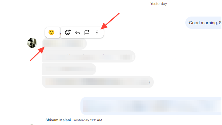 Step 3: Locate the specific message in the conversation. Hover your mouse cursor over the message to reveal additional options, and click on the 'Ellipsis' icon (three vertical dots) that appears.