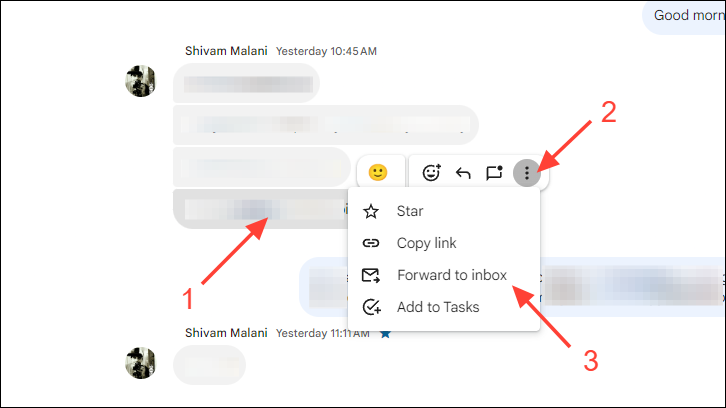 Step 3: Find the specific message, hover over it, and click the 'Ellipsis' icon. From the options, choose 'Forward to inbox'.