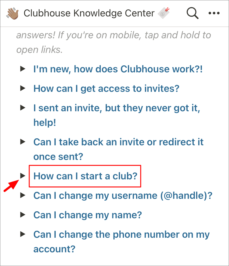 A new tab will open in your browser, the Clubhouse Knowledge Center. You can find answers to various common questions or issues on this page. Search for ‘How can I start a club?’ and then tap on the triangle right before it to expand the answer.