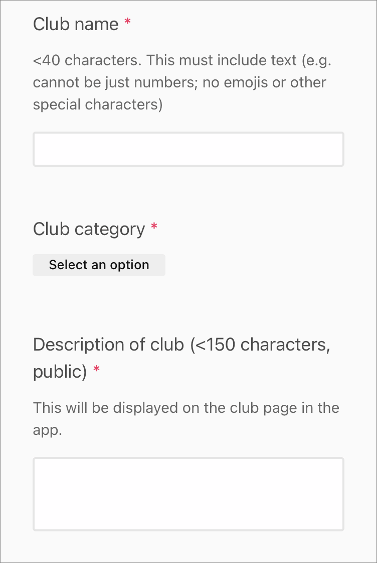 The first section of the form is ‘Club name’ which has a 40 character limit. Enter a suitable name for the club, and then proceed further.
