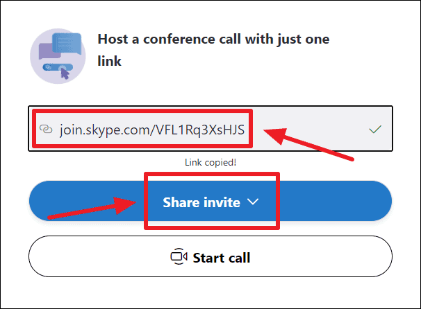 Step 3: To invite participants, click on the 'join.skype.com/…' link to copy the invitation link to your clipboard. Alternatively, use the 'Share invite' button to send the link directly via email.