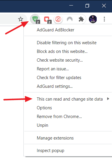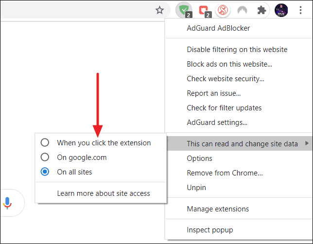 Step 1: To adjust an extension's permission to read and change site data, right-click on the extension's icon in the Chrome toolbar. Hover over the option labeled "This can read and change site data" to reveal additional settings.
