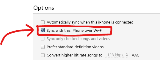 We’d recommend enabling the “Sync with this iPhone over Wi-Fi” option though. If your computer and iPhone are often connected to the same network, you can sync your iPhone wirelessly to your computer with a single click.