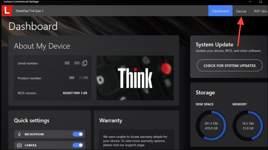 Lenovo Vantageand click on the application when it appears in the search results. If it is not installed, you can download and install it from the Microsoft Store. - When the Lenovo Vantage application launches, click on the 'Device' tab on the top right.