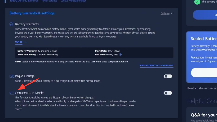 - Scroll down and click on the 'Conservation mode' toggle to turn it on. If you're using an older version of the program, go to the Power menu from the Device tab to limit your battery charging. Once you enable it, your battery will not charge over 80% of its full capacity.