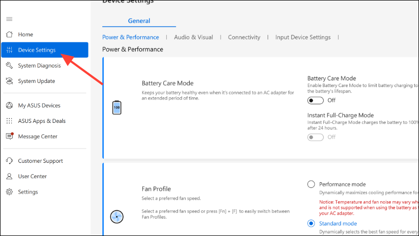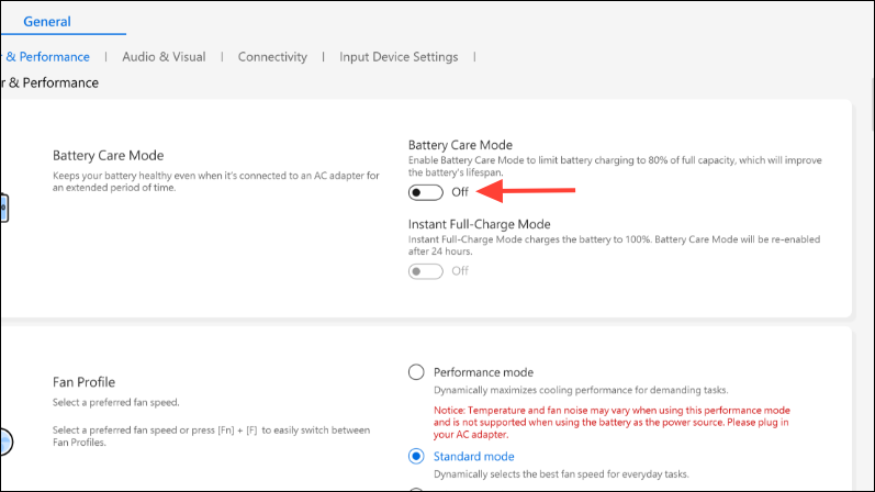 - Then click on the 'Battery Care Mode' toggle under the 'Power and Performance' section and turn it on.