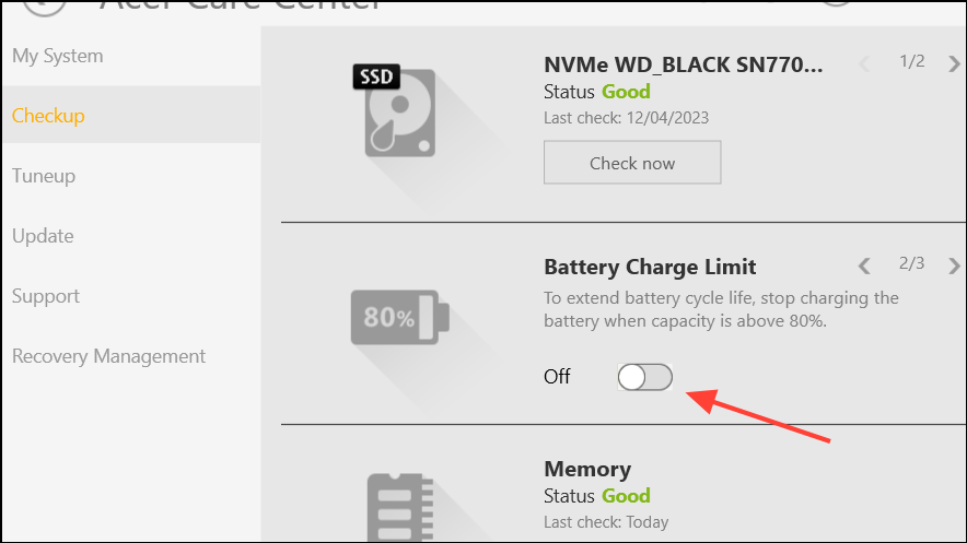 - Then click on the 'Battery Charge Limit' toggle and turn it on. This option will only be present if your laptop supports the feature.