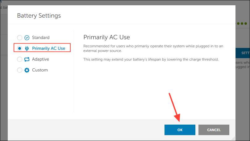 - Then click on the 'Primarily AC Use' option to select it and click on the 'OK' button.