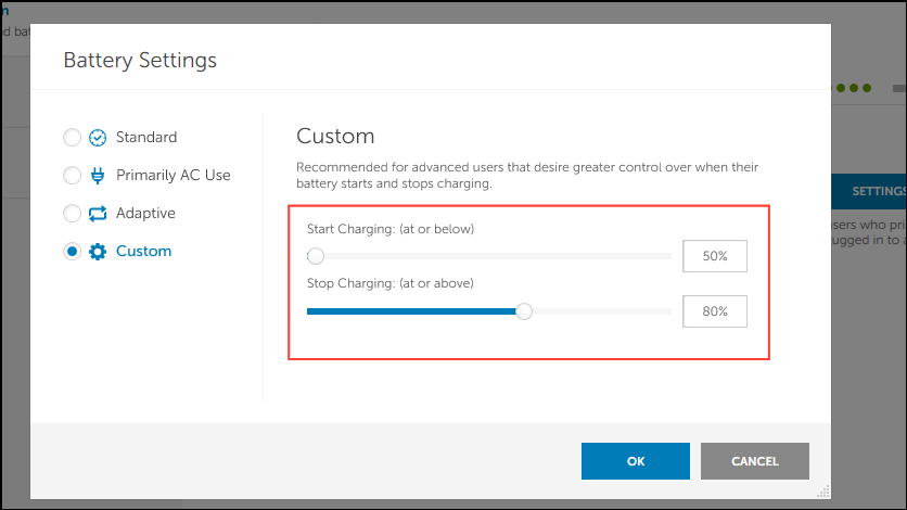 - Then you can set the battery percentage at which your laptop will start and stop charging using the sliders on the right.