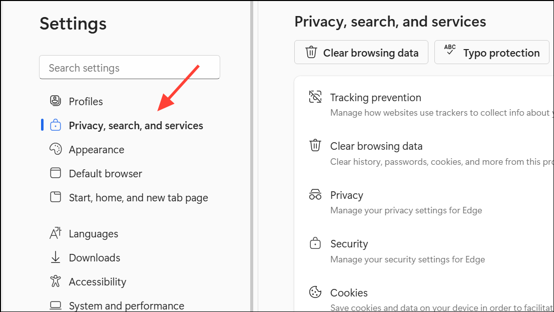 Step 4: In Microsoft Edge, click the three dots on the top right, go to Settings > Privacy, Search and Services.