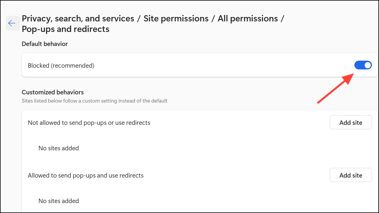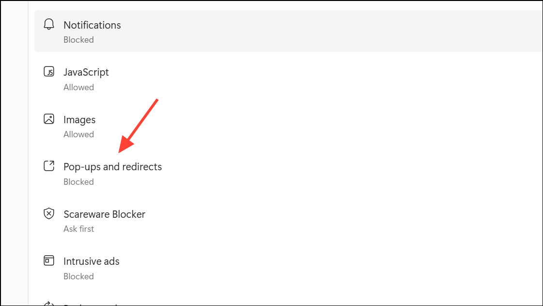 Step 7: Go back to the All permissions page and select Pop-ups and redirects.