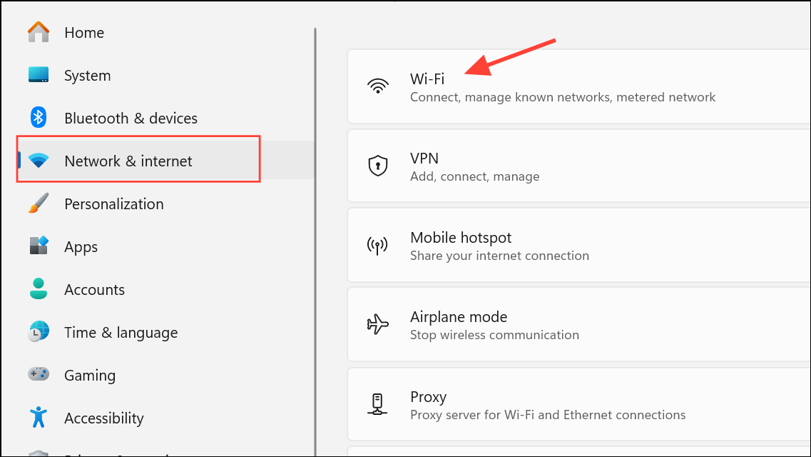 Step 2: In the left sidebar, select Network & Internet, then click on Wi-Fi to view available and known networks.