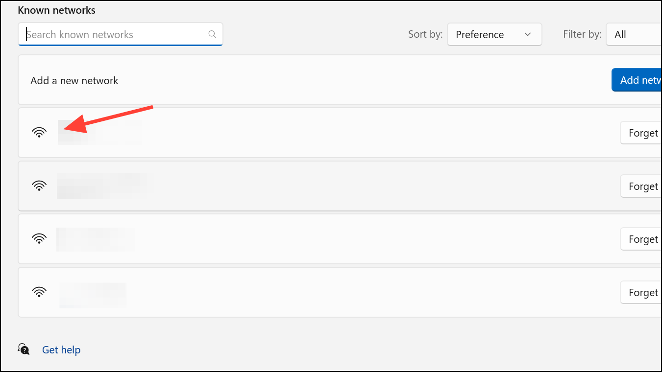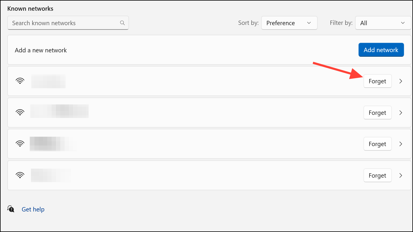 Step 2: Find the Wi-Fi network you want to remove and click Forget. This deletes the saved network profile and its password from your PC.