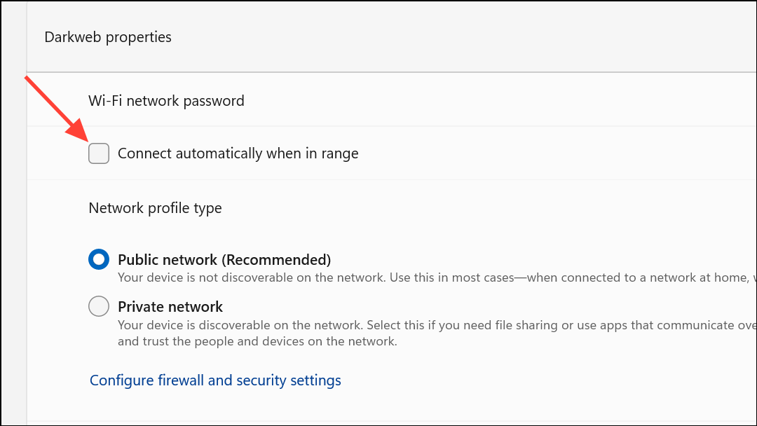 Step 5: Find the option labeled Connect automatically when in range and toggle it off. This setting ensures Windows 11 won’t automatically join this network in the future, though you can still connect manually if needed.