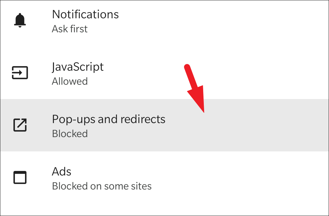 Finally, on the next screen, make sure the toggle switch following the ‘Pop-ups and redirects’ option is in the ‘Off’ position. If it is not, tap on it to bring it to the ‘Off’ position.