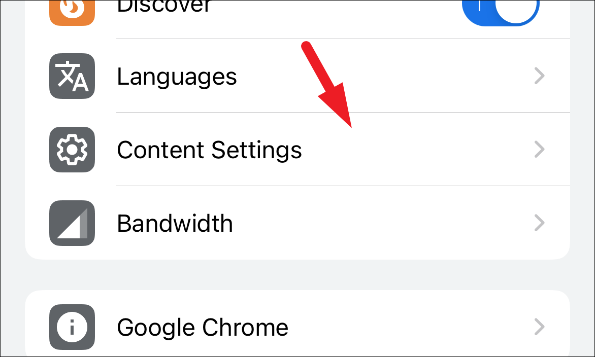 Next, from the Settings screen, scroll down till you locate the ‘Content Settings’ option and tap on it to proceed.