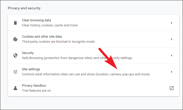 Next, on the ‘Privacy & security’ screen scroll down the page to locate the ‘Site settings’ tile and click on it to continue.