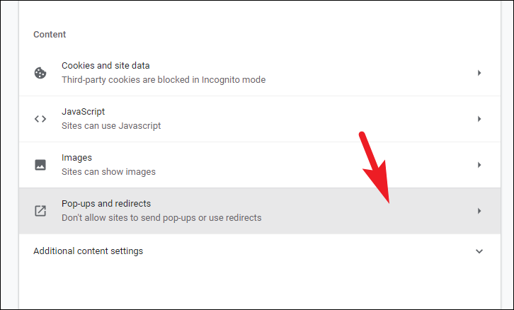 After that, scroll down till you locate the ‘Content’ section and click on the ‘Pop-ups and redirects’ tile.