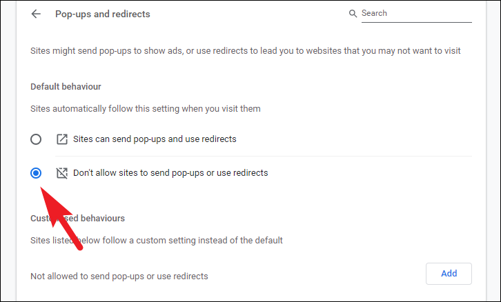 Finally, on the ‘Pop-ups & redirects’ screen, under the ‘Default behaviour’ section, click on the radio button preceding the ‘Don’t allow sites to send pop-ups or use redirects’ option if not already selected.