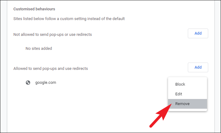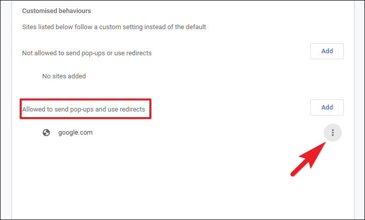 In order to make sure that there is no kind of pop-ups allowed, scroll down and locate the ‘Allowed to send pop-ups or use redirects’ section. If there are any unwanted websites present, click on the kebab menu (three vertical dots) present on the right side of the individual website listing. This will reveal an overflow menu.