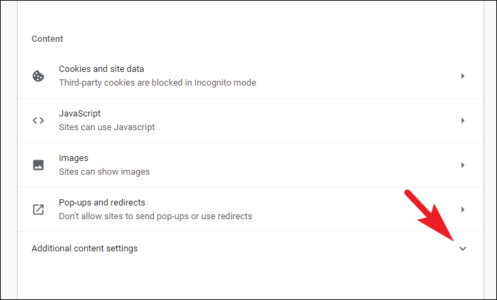 To do so, head back to the ‘Site settings’ page and click on the chevron present right beside the ‘Additional content settings’ option. This will reveal a list of options on the screen.
