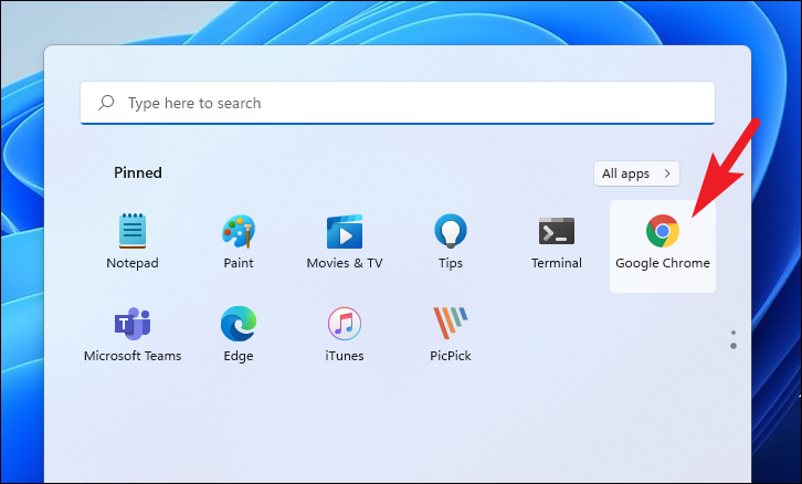 First, open the Chrome browser either from the desktop shortcut, pinned shortcut on taskbar, pinned apps on the Start Menu, or by searching for it.