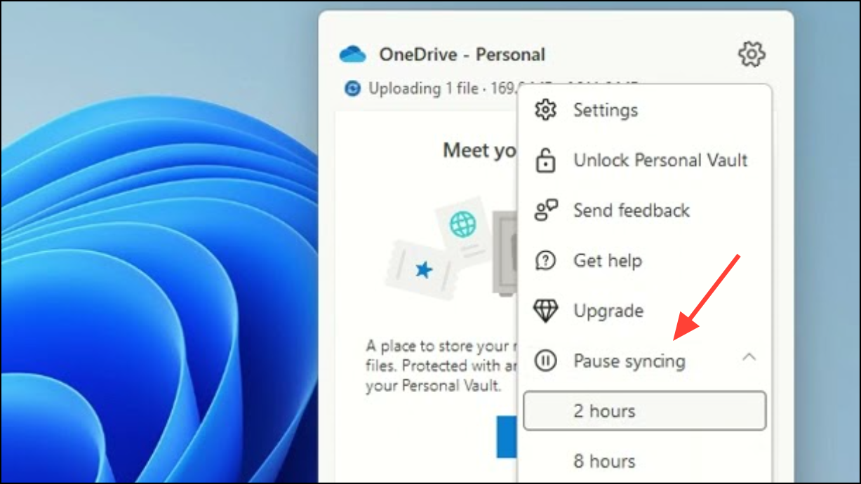 Step 3: From the menu, select Pause syncing. Choose the duration for which you want to pause syncing: 2 hours, 8 hours, or 24 hours. The OneDrive icon will display a "Paused" status to indicate syncing is halted.