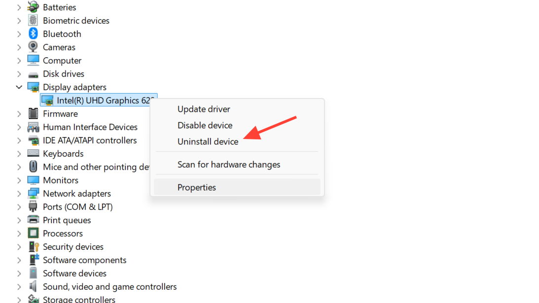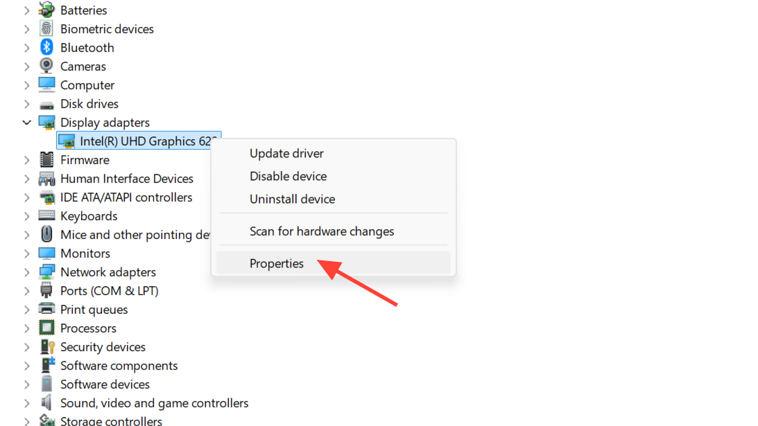- Right-click your display adapter (for example, Intel UHD Graphics, Intel Iris Xe, NVIDIA, AMD) and choose Properties.