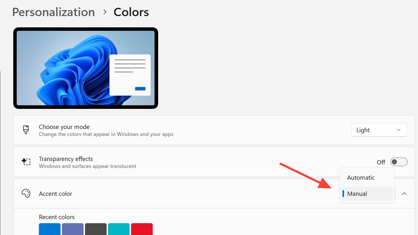 - Set Accent color to Manual instead of automatically picking colors from your background.