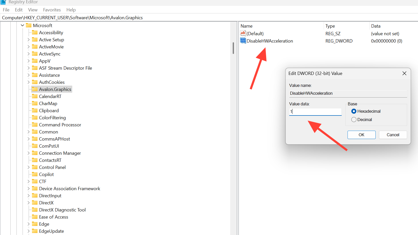 DisableHWAccelerationexists, double‑click it and set Value data to1. If it doesn’t exist, create a new DWORD (32‑bit) value with that name and set it to1. - Restart Windows.