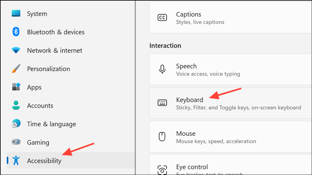 Step 2: Navigate to the Accessibility section, then select Keyboard from the sidebar. In some Windows 11 builds, this may appear under Ease of Access or simply as Keyboard within Settings.