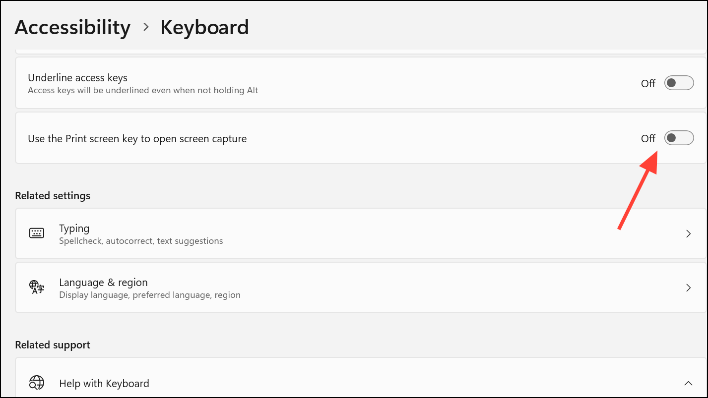 Step 3: Find the option labeled Use the Print Screen key to open screen capture or similar wording. Toggle this setting to the Off position. This action restores the Print Screen key’s original behavior, allowing it to copy the entire screen to the clipboard instead of launching Snipping Tool.