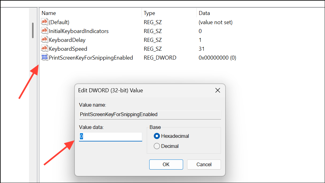 Step 3: Look for a value named PrintScreenKeyForSnippingEnabled. If it exists, double-click and set its value to 0. If it does not exist, right-click in the right pane, select New > DWORD (32-bit) Value, name it PrintScreenKeyForSnippingEnabled, and set its value to 0.