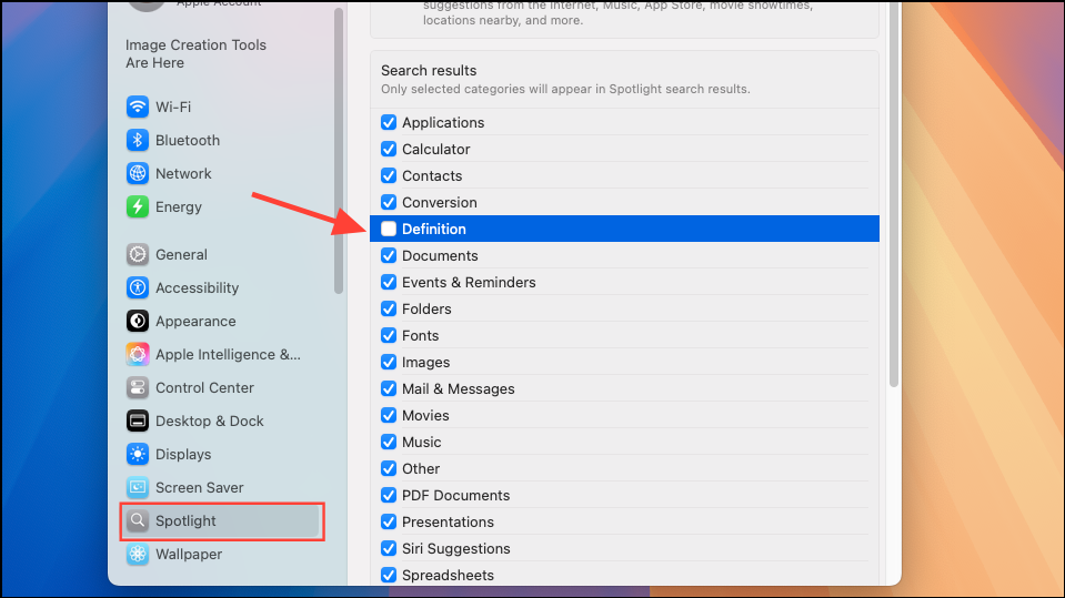 Step 2: In the sidebar, select Spotlight. You will see a list of file categories that Spotlight indexes. Deselect any categories you do not need, such as "Mail & Messages," "Music," or "Images." Reducing the number of indexed categories directly reduces the size of Spotlight's database.