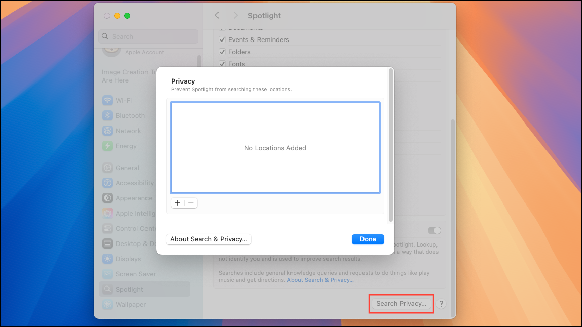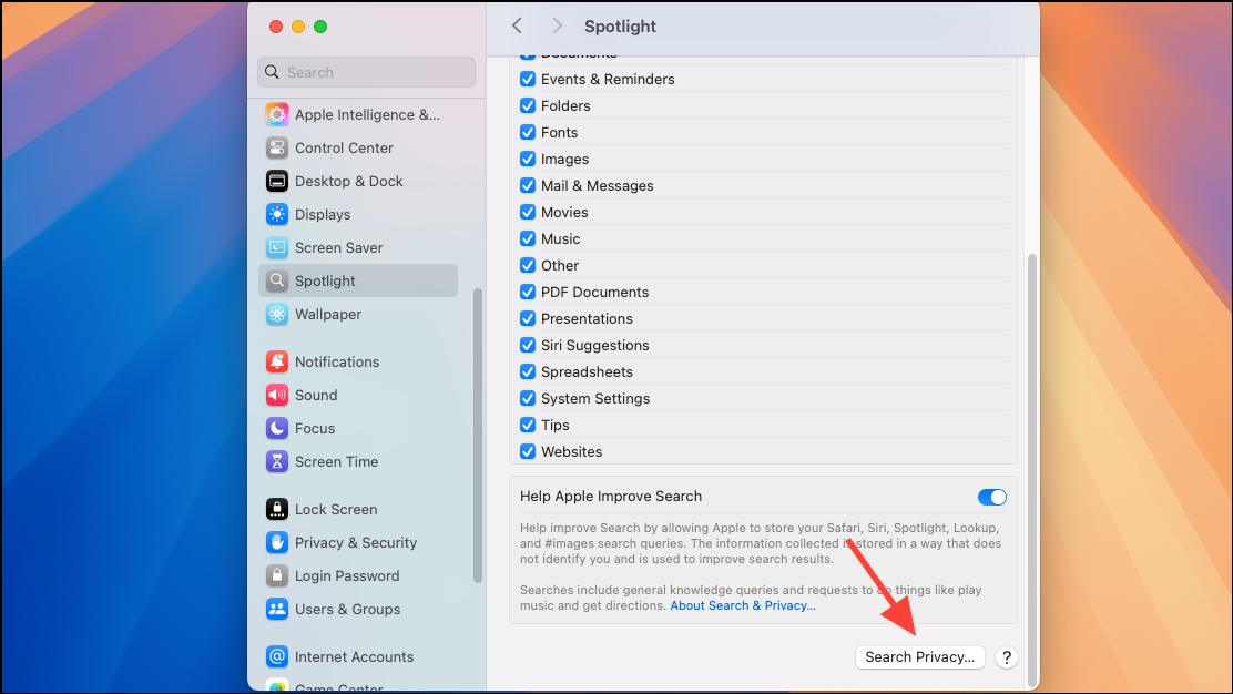 Step 1: Open System Settings and navigate to Spotlight > Search Privacy.