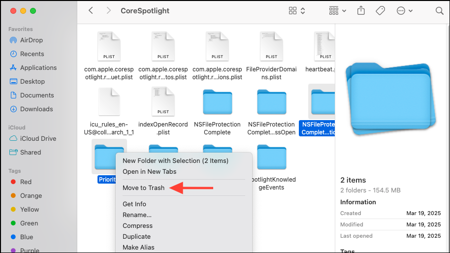 Step 3: In the CoreSpotlight folder, locate and delete the subfolders named "Priority" and "NSFileProtectionCompleteUntilFirstUserAuthentication". These folders contain the largest Spotlight index files.