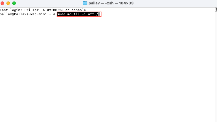 Step 2: Type the following command and press Return to disable Spotlight indexing: