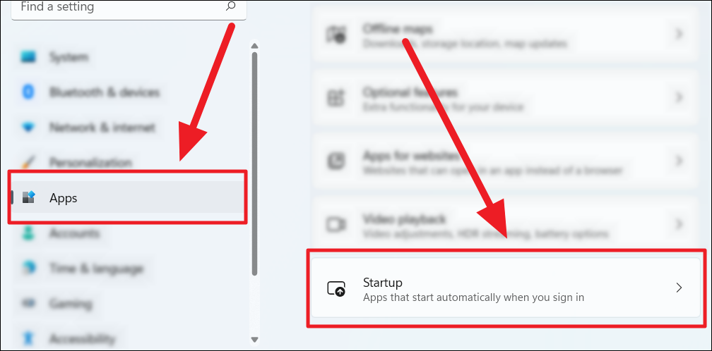 Once your reach the ‘Settings’ app page, click the ‘Apps’ option on the left list of options. Scroll through to the end of the ‘Apps’ settings page on the right and click the ‘Startup’ tile.
