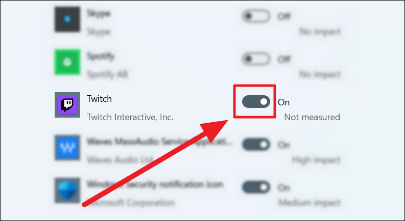 Navigate to the ‘Twitch’ option in the ‘Startup Apps’ list, and click the toggle button next to it. Ensure the toggle is outlined and not filled. An outlined toggle suggests disabling auto-startup for Twitch.