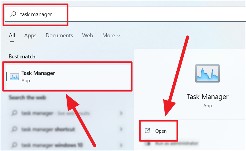 Then, type ‘Task Manager’ in the ‘Search’ field. Select the right option from the search results or click the ‘Open’ button in the ‘Task Manager’ app options on the right.