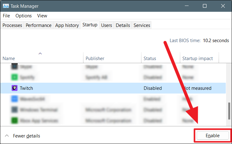 Twitch is now disabled from launching at startup. To enable, click the app’s name and then the ‘Enable’ button in the same place as the ‘Disable’ button. Or double-finger tap on Twitch and select ‘Enable’.