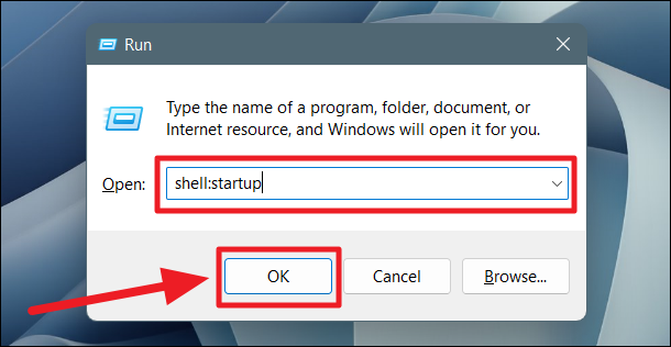 First, open ‘Run’ by pressing the Windows and R on your keyboard. Then, enter shell:startup in the ‘Open’ text field. Click ‘OK’ or hit Enter.